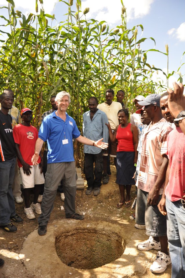 | Our group -me (Amanda Farahany), Sheryl McCalla and Ed Buckley fill a bucket of water at an artesian well. Kids are sent here daily to get water to take to their homes and families. |