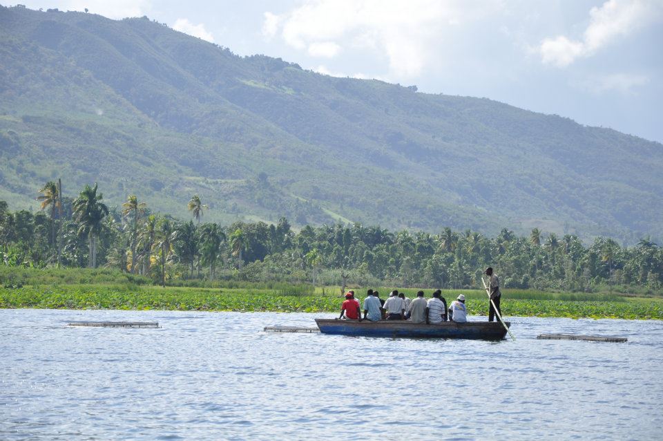| In a fishing village in Haiti, Haitians travel out to the lake twice a day to feed the fish they have in these cages. The fish are raised and then sold at market, creating a self-sustaining village. |