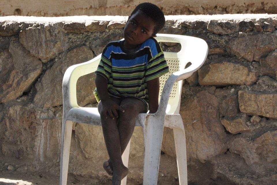| This child was across from the school, watching the kids in school getting educated. Without shoes or a uniform, he can’t attend the school that is across the street. |