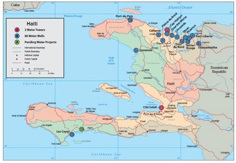 In looking at the next project, I thought it would be good to reflect on what has been accomplished. Along with this post is a map of the existing wells and water towers. The red dots are the water towers and the blue dots denote the location of  exiting wells – over eighty of them. The green dots are pending projects.